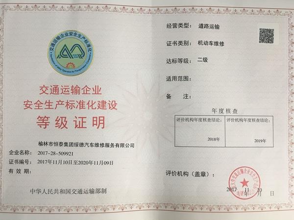 日前,陜西省交通廳發(fā)出“關于交通運輸企業(yè)安全生產標準化二、三級達標企業(yè)的通知”,根據《交通運輸企業(yè)安全生產標準化建設評價管理辦法》、《交通運輸企業(yè)安全生產標準化達標考評指標》要求,經自評、申請、受理、評價、審核、審定等程序,集團公司東風汽車公司陜西榆林技術服務站、榆林市恒泰運輸集團綏德汽車維修服務有限公司兩個修理廠被認定為“交通運輸企業(yè)安全生產標準化二級達標企業(yè)”,現已發(fā)證。 資質證書有效期為2017年11月10日至2020年11月09日。此次安全生產標準化二級達標證書的獲得,完善了集團公司安全生產標準化管理體系,推動集團公司安全工作又上了一個新臺階。(圖文 侯勇鵬)