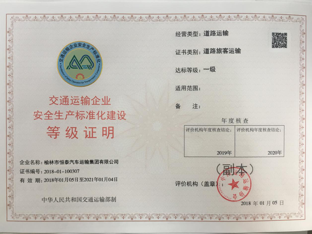 近日,集團(tuán)公司收到中國(guó)道路運(yùn)輸協(xié)會(huì)評(píng)價(jià)中心頒發(fā)的榆林恒泰集團(tuán)40個(gè)安全生產(chǎn)標(biāo)準(zhǔn)化一級(jí)達(dá)標(biāo)換證復(fù)評(píng)證書,集團(tuán)公司持續(xù)一年的安全生產(chǎn)標(biāo)準(zhǔn)化換證復(fù)評(píng)工作圓滿完成。